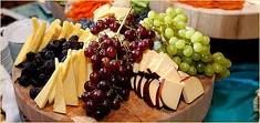 Cheese platter-various cheese, fresh grapes, strawberries served with a side of crackers and sliced bread.